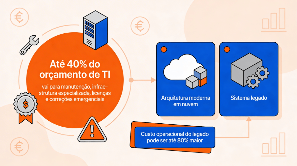 Manter um sistema legado consome até 40% do orçamento de TI, somando manutenção, infraestrutura especializada, licenças e correções emergenciais. Em muitos casos, o custo operacional de um legado chega a ser 80% maior do que uma arquitetura moderna em nuvem.
