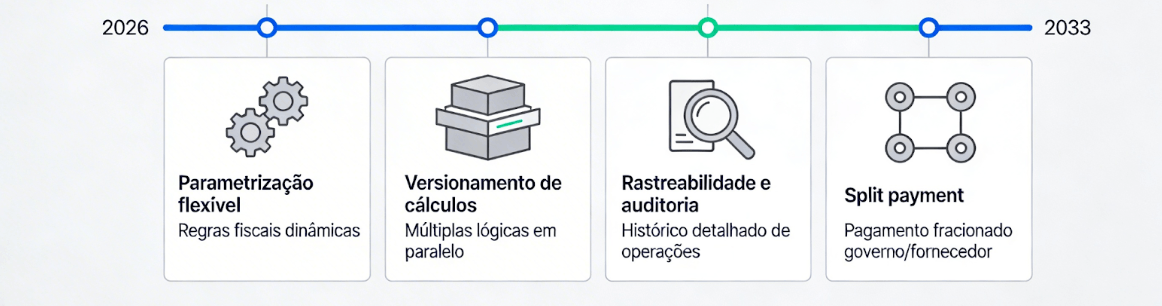 A Reforma Tributária não é “só mais uma mudança de regra”. Ela força uma revisão estrutural de como sistemas tratam tributos sobre consumo. Entre 2026 e 2033, as empresas vão conviver com modelos tributários antigos e novos, exigindo:
