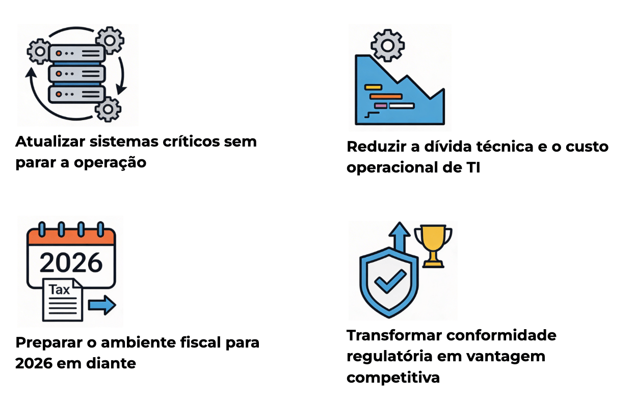 Com a Reforma Tributária (Emenda Constitucional 132/2023) entrando em fase de testes em 2026, a janela para adaptar sistemas legados está se fechando. E o custo de não agir agora pode ser bem maior do que o de modernizar.
